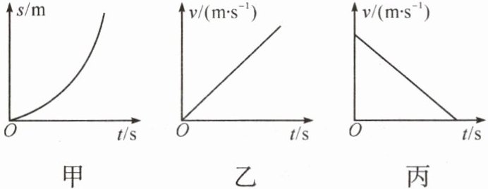 甲、乙是加速直线运动的 s-t 图像和 v-t 图像;丙是减速直线运动的 v-t 图像。