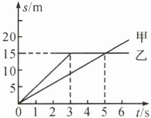A 解析:由s-t图可知,0~3s内乙做匀速直线运动,乙运动的距离是15m,3~5s内,乙处于静止状态,0~5s,乙的平均速度$v_{乙}=\frac{s_{乙}}{t}=\frac{15m}{5s}=3m/s$,故A正确,B错误;甲做匀速直线运动,甲的速度$v_{甲}=\frac{s_{甲}}{t}=\frac{15m}{5s}=3m/s$,4s时,甲运动的距离$s_{甲}=v_{甲}t=3m/s×4s=12m$,4s时,乙运动的距离$s_{乙}=15m$,4秒时,乙在甲前方:$\Delta s=s_{乙}-s_{甲}=15m-12m=3m$,故C错误;5s时,甲的速度是3m/s,乙是静止状态,速度不同,故D错误。