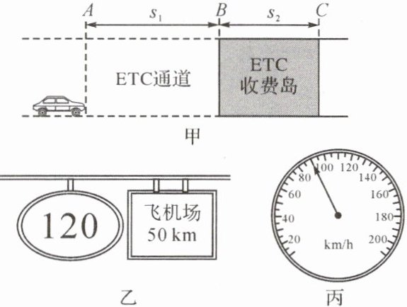 例2 小康一家去旅游,开车前往飞机场,经过高速公路入口的 ETC 收费通道(如图甲)时,到达 A 处开始减速,AB 段$s_{1}= 50m$,经$t_{1}= 4s$后运动至 ETC 收费岛(图中阴影区域)边界 B 处,然后再以 21.6km/h 的速度匀速通过 ETC 收费岛 BC 段,BC 段$s_{2}= 36m$。在高速路上行驶时,小康看到如图乙所示的交通标志牌,此时刚好收音机播报为上午 10:00 整。求: