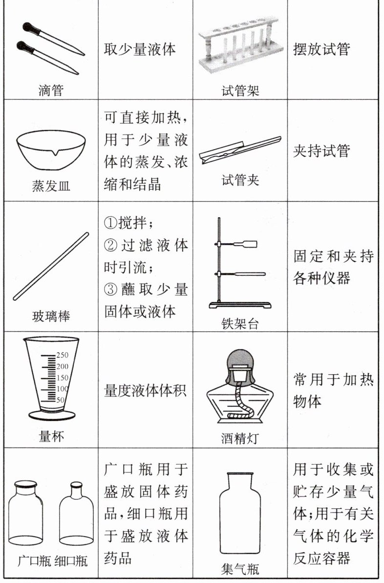 | 玻璃棒|①搅拌;②过滤液体时引流;③蘸取少量固体或液体| 铁架台|固定和夹持各种仪器|
