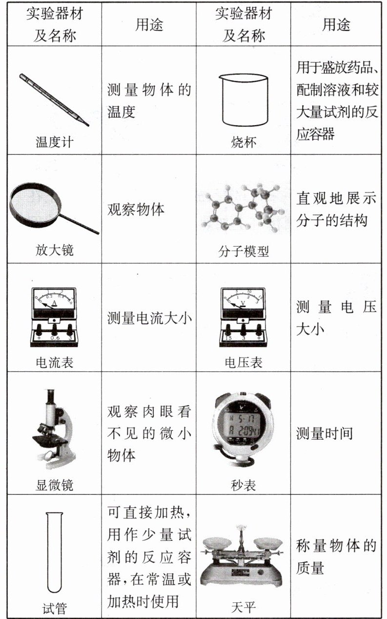 | 温度计|测量物体的温度| 烧杯|用于盛放药品、配制溶液和较大量试剂的反应容器|