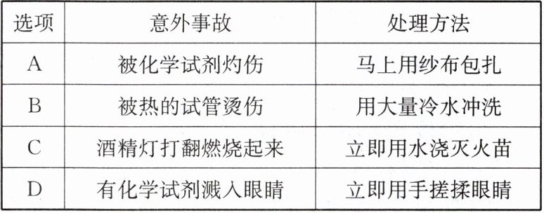 |A|被化学试剂灼伤|马上用纱布包扎|