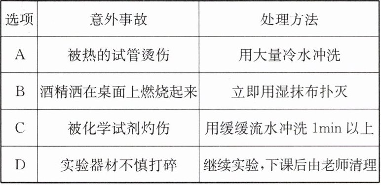 |D|实验器材不慎打碎|继续实验,下课后由老师清理|