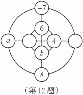 12.爱动脑筋的小亮同学设计了一种“幻圆”游戏,如图所示,将$-1$,$2$,$-3$,$4$,$-5$,$6$,$-7$,$8$分别填入图中的圆圈内,使横、竖以及内外两圈上的4个数字之和都相等,他已经将$4$,$6$,$-7$,$8$这四个数填入了圆圈,则图中$a+b$的值为______。