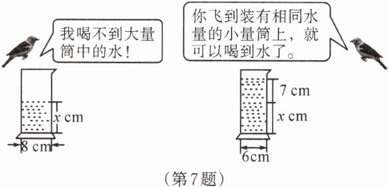 所以π·(8/2)²·x=π·(6/2)²·(x+7),解得x=9。