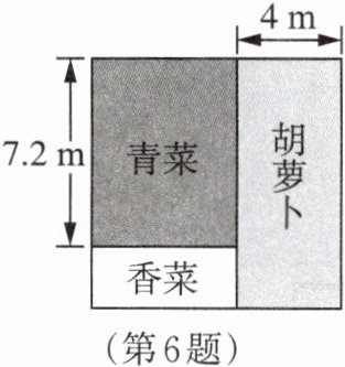 6. 李爷爷在一块正方形菜园中按如图所示的方法划分出三块长方形地用来种胡萝卜、青菜和香菜,其中胡萝卜地的一边长是4 m,青菜地的一边长是7.2 m,这样划分后,青菜地和胡萝卜地的面积恰好相等,求这块正方形菜园的边长。