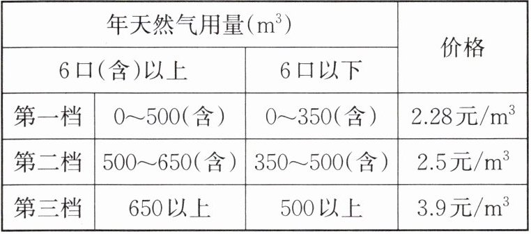 11. 某市居民生活用气采用阶梯价格制度,一般生活用气收费标准如下表所示,比如6口以下的家庭的年天然气用量在第二档时,其中$350\ m^3$按2.28元/$m^3$收费,超过$350\ m^3$的部分按2.5元/$m^3$收费。小锋一家有五口人,他想帮父母计算一下实行阶梯气价后,家里天然气费的支出情况。