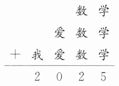 $\begin{array}{r} \quad 数 学\\ 爱 数 学\\ +我 爱 数 学\\ \hline 2 0 2 5\end{array} $