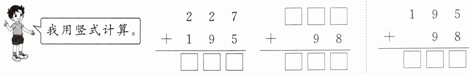 $\begin{array}{r} 227\\ +195\\ \hline □□□\end{array}\\ \hline □□□ $ $\begin{array}{r} □□□\\ +\quad98\\ \hline □□□\end{array}\\ \hline □□□ $