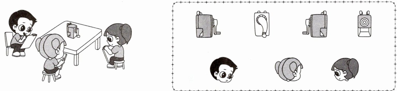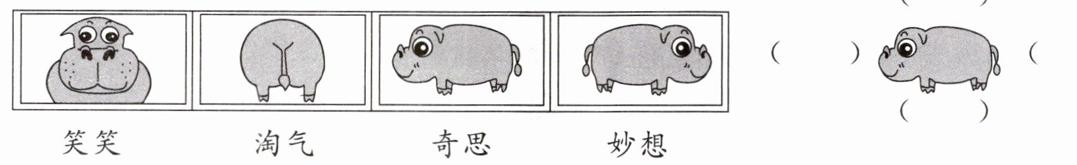 4. 四个小朋友去河马馆参观,回来后每个人画了自己看到的河马。你知道他们参观时分别站在哪里吗?填一填。