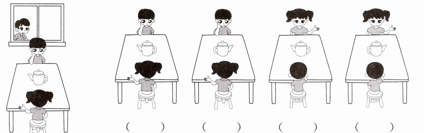2. 下面哪幅图是小明站在窗外看到的?在正确答案下面的括号里画“√”。