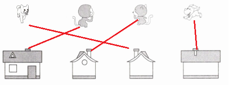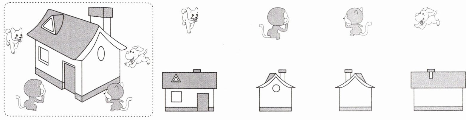 四、四只动物来看笑笑家的新房子。下面四幅图分别是哪只动物看到的?连一连。