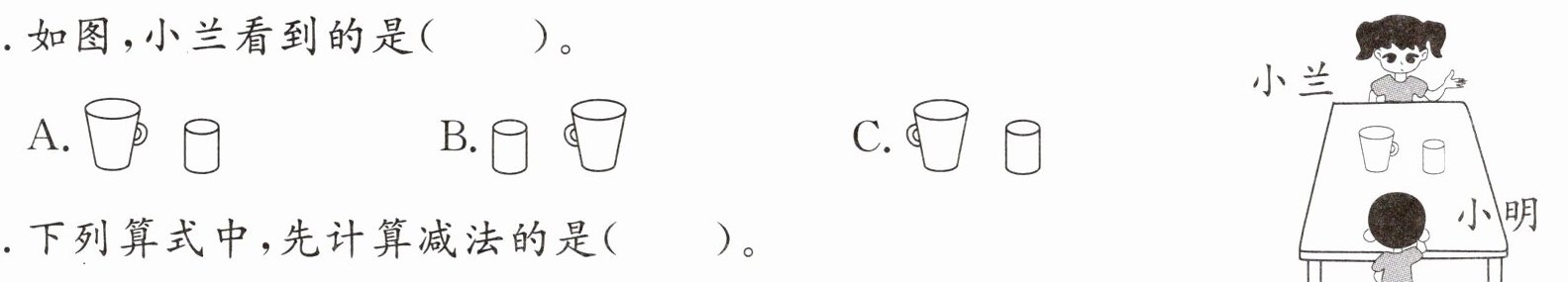 1. 如图,小兰看到的是( )。