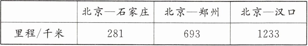 | 里程/千米 | 281 | 693 | 1233 |