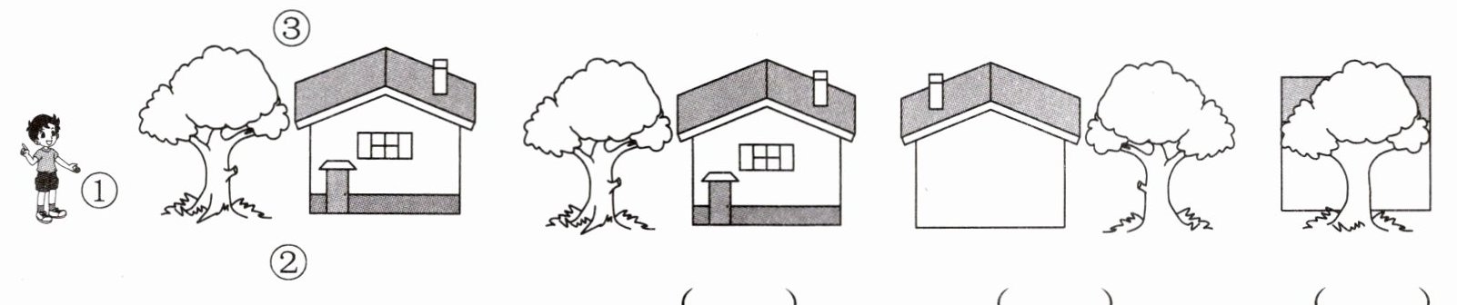 四、下面各图分别是淘气站在哪个位置看到的?请把序号填在相应的括号里。