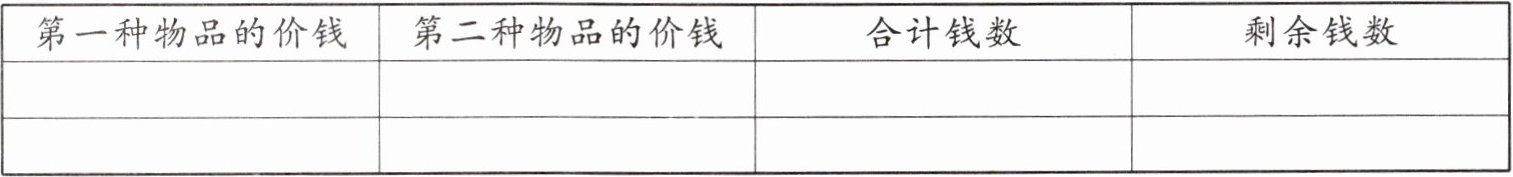 |第一种物品的价钱|第二种物品的价钱|合计钱数|剩余钱数|