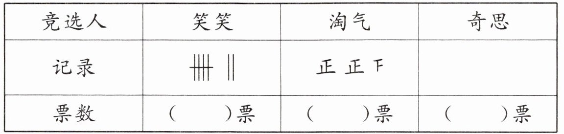 )票|(1)把表格填写完整。(用你自己喜欢的方式记录奇思的得票情况)