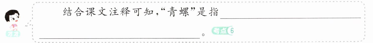 1.青绿色的螺。这里比喻洞庭湖中的君山 远远望去,洞庭湖上一片苍翠,君山好似白银盘里的一枚青螺。 2.拨弄蟋蟀 篱笆 料想是小孩在拨弄蟋蟀,因为夜深了,篱笆下还亮着灯火。