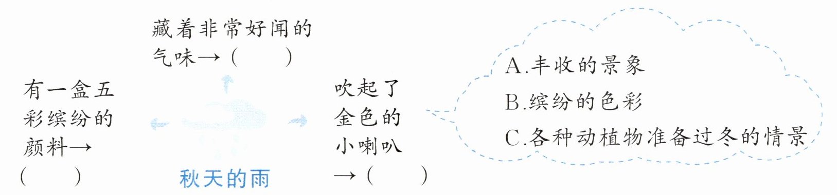 。3.它把黄色给了银杏树,黄黄的叶子像一把把小扇子,扇哪扇哪,扇走了夏天的炎热。(秋天的雨还会把颜色分给谁呢?发挥想象写一写)