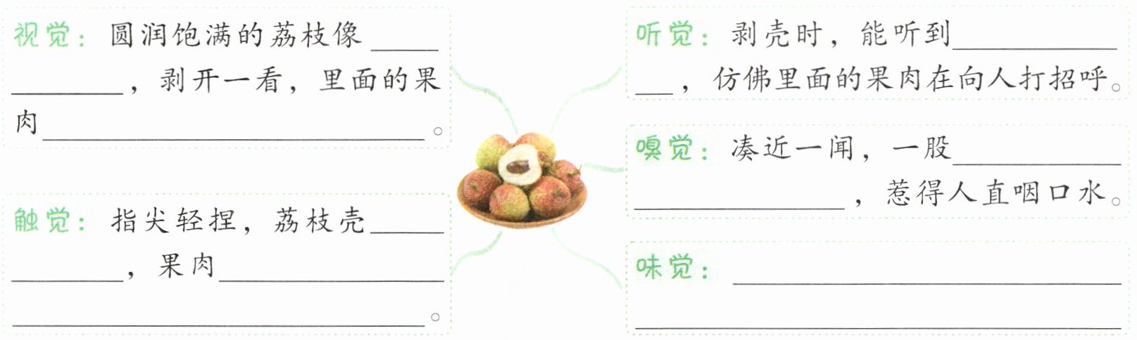 1. 请你调动多种感官细致地观察荔枝,将下面的内容补充完整。