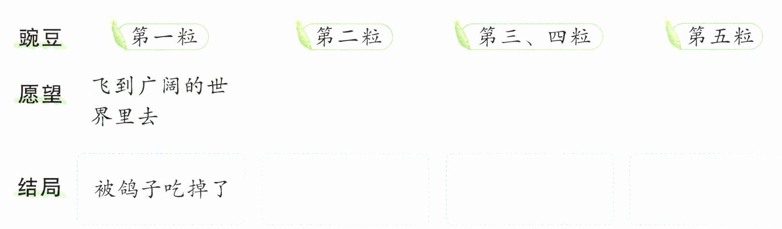 五、课文中的五粒豌豆分别有怎样的愿望和结局?请将下面的导图补充完整。