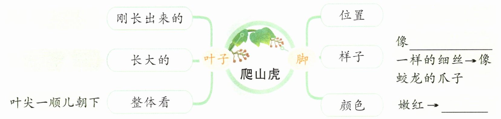 2. 爬山虎刚长出来的叶子是嫩红的,不几天叶子长大,就变成嫩绿的。