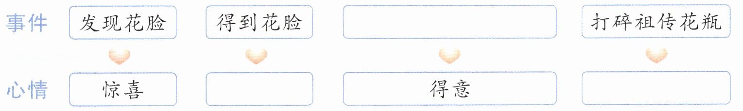 1. 选文围绕“花脸”,记叙了一件童年趣事,请你梳理事件和“我”的心情变化。