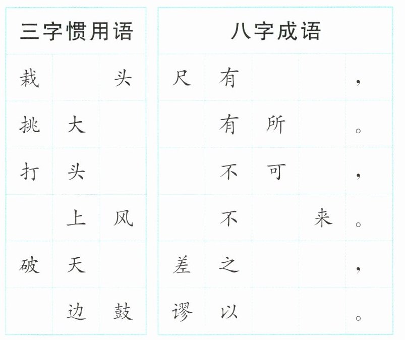 1.三字惯用语:跟 梁 阵 占 荒 敲 八字成语:所 短 寸 长 机 失 时 再 毫 厘 千 里 2.