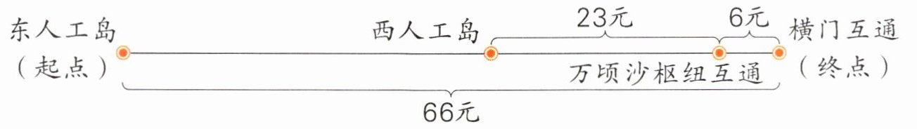 2 如图,深中通道全线车辆通行费收费标准为66元/标准车次,其中西人工岛至万顷沙枢纽互通23元/标准车次、万顷沙枢纽互通至横门互通6元/标准车次。东人工岛至西人工岛收多少钱?