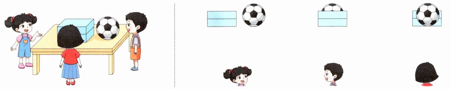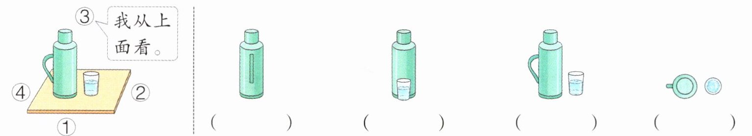 1. (佛山真题) 下面右边的四幅图分别是从哪个位置看到的? (填序号)