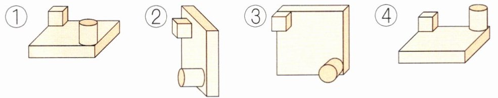 ①和③是相同的。[解析]观察4幅图发现,①②③中正方体和圆柱均处于对角,④中正方体和圆柱在同一边。①③中正方体和圆柱靠边,②中正方体和圆柱没有靠边,所以物体①和③相同。