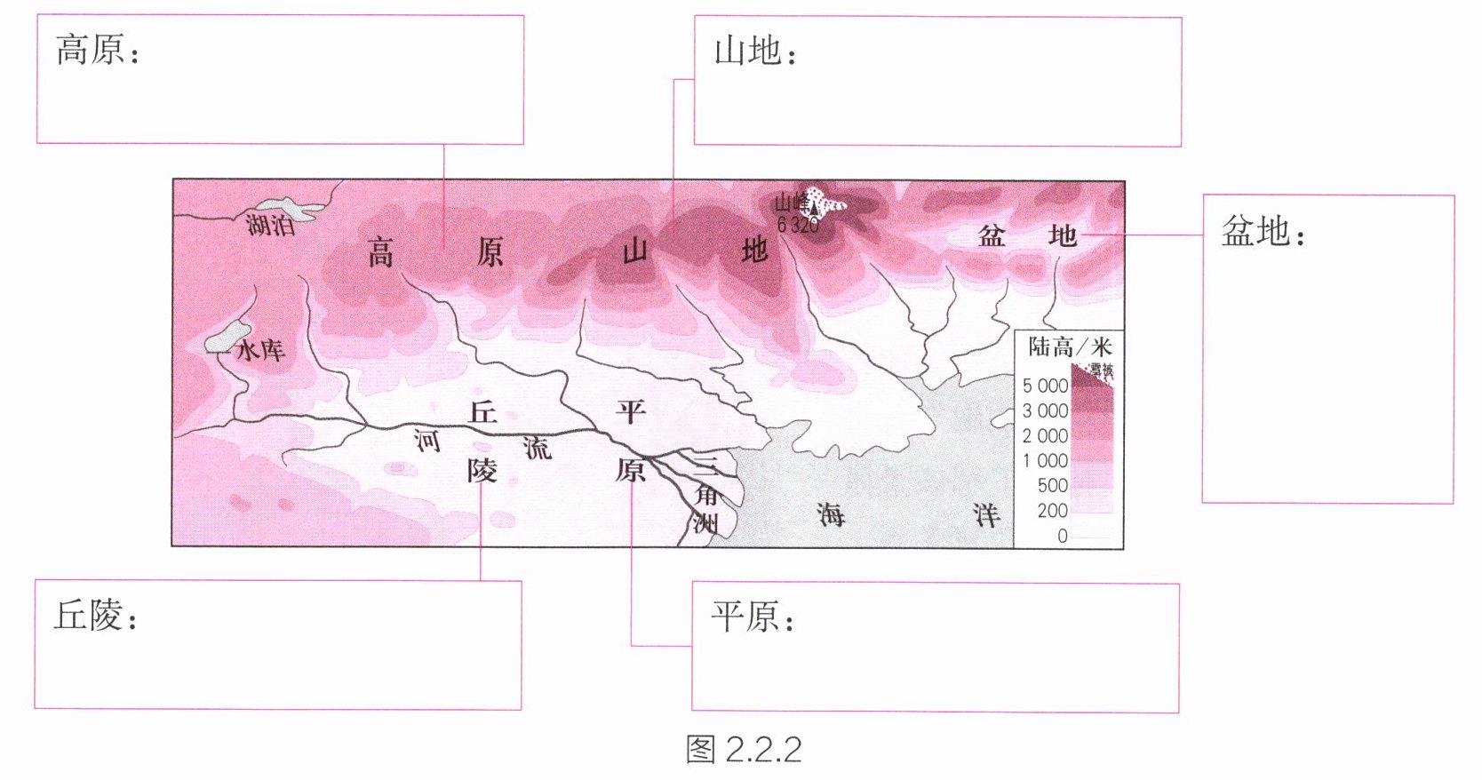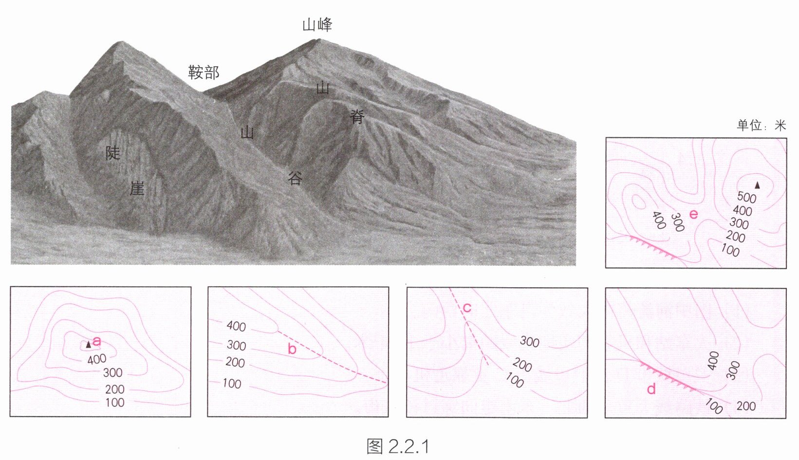 读图 2.2.2,在字框中填写五种地形的等高线特点。