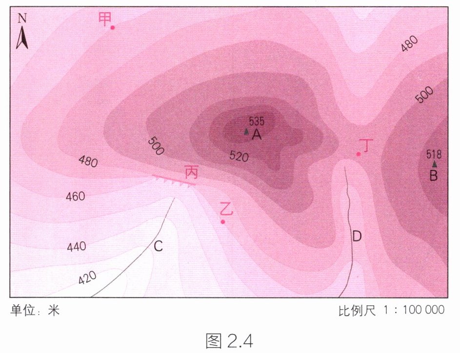 5. 某中学地理兴趣小组对图2.4所示的地区展开了研究性学习,得出了许多结论。试根据研究方向和思路,判断下列研究结论的正误并说明理由。