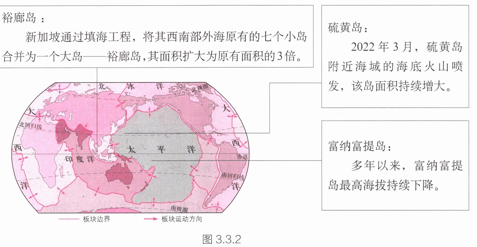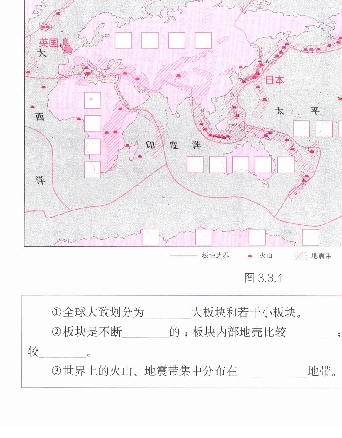 读图3.3.1,运用板块运动的观点解释表3.3.1中列出的地理现象。