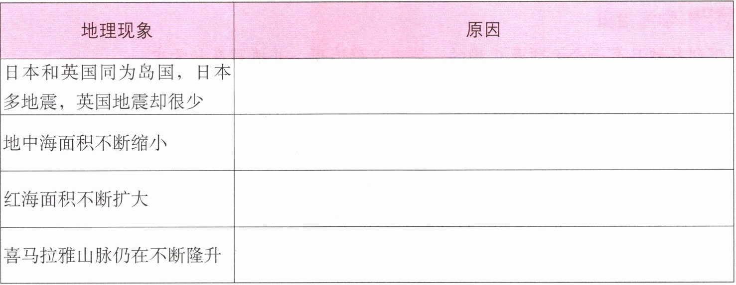 由上至下:日本位于亚欧板块与太平洋板块交界处,地壳活跃;英国位于亚欧板块内部,地壳相对稳定 亚欧板块与非洲板块不断碰撞挤压 印度洋板块与非洲板块做张裂运动 亚欧板块与印度洋板块不断碰撞挤压