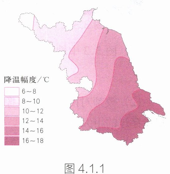 江苏某年12月15日8时—17日8时降温预报图如图4.1.1所示,省气象台发布寒潮橙色预警和海上大风黄色预警。据此完成下列各题。
