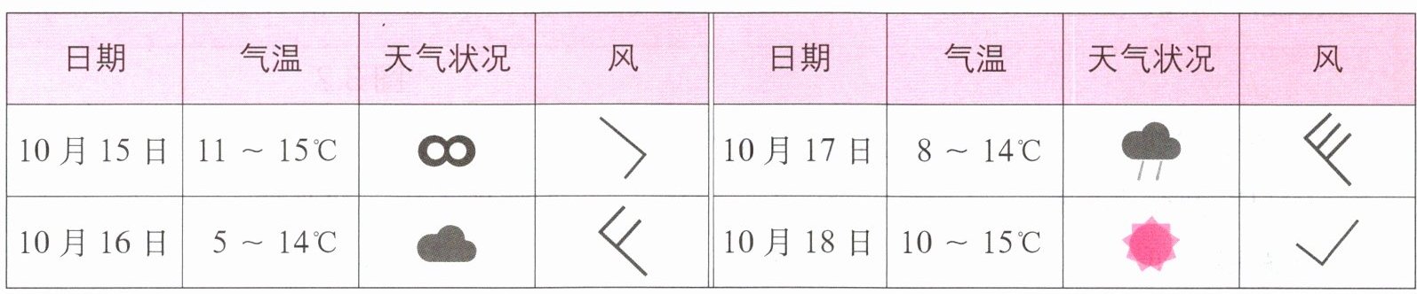 (1)根据表中的天气信息,10月15日会出现的天气现象是____,需戴好口罩;10月16日气温日较差为____℃,应注意增减衣物;10月17日____风(风向)____级,外出时需远离广告牌等容易被大风刮倒的物体。