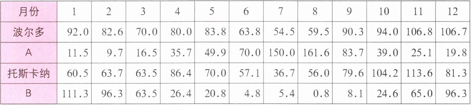 (3) 波尔多、托斯卡纳和烟台三个葡萄酒产地降水的显著差异表现在____(年降水量/降水季节分配)。