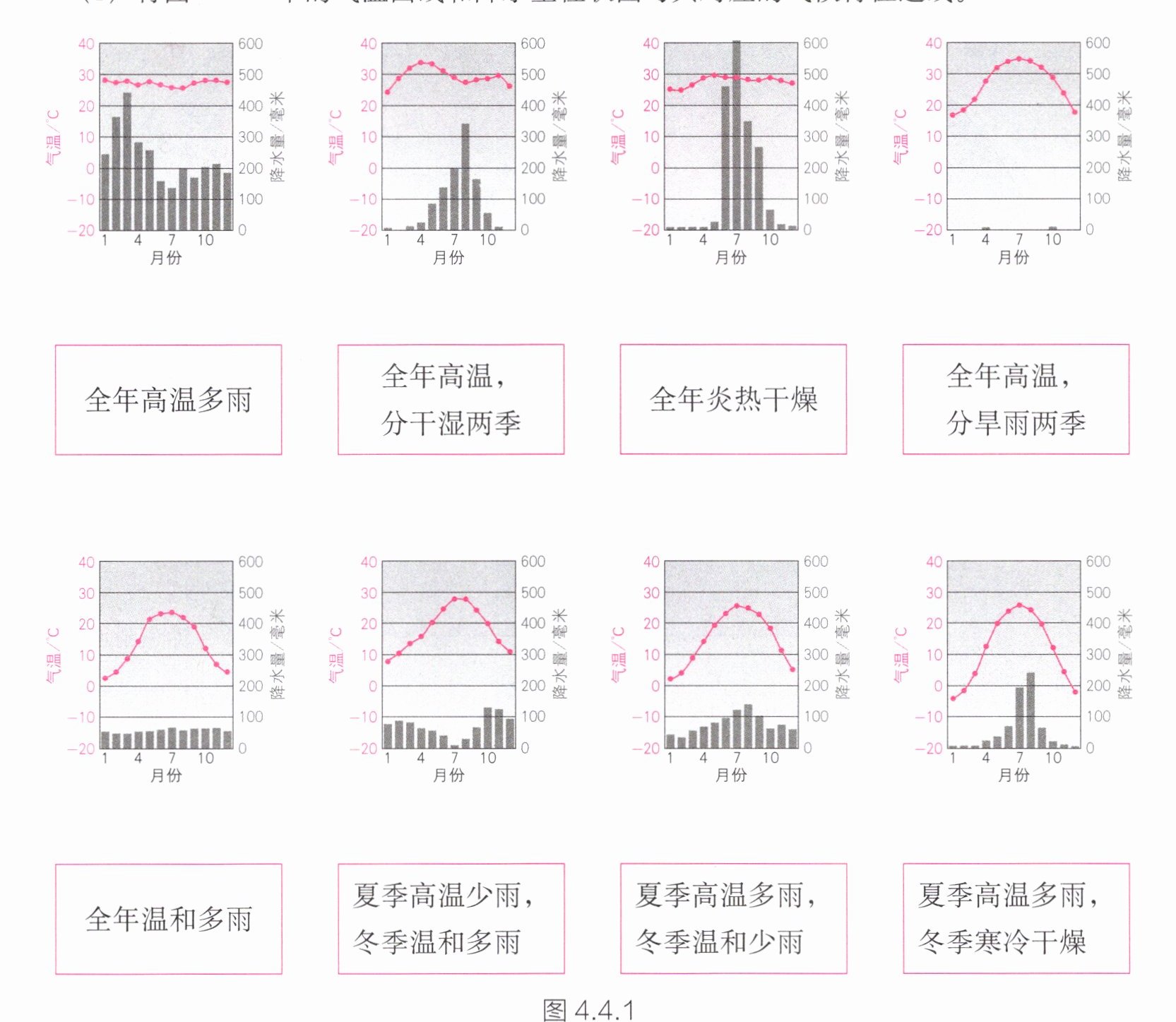 (1) 将图 4.4.1 中的气温曲线和降水量柱状图与其对应的气候特征连线。