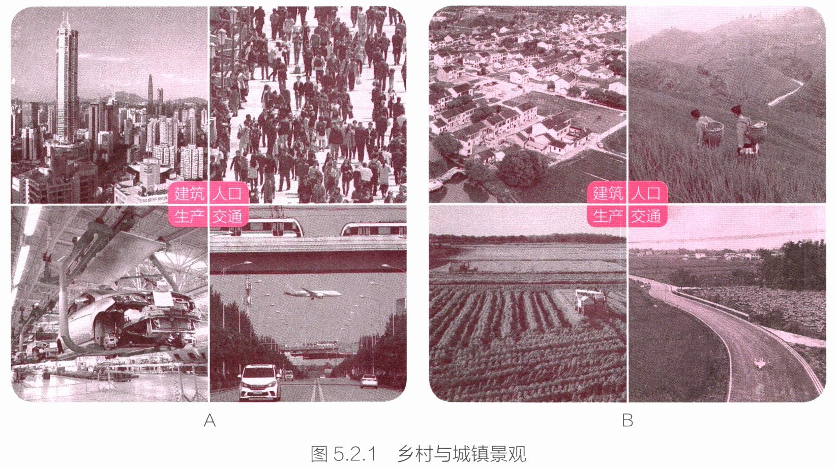 (1)图5.2.1的A、B两组图中,____图是乡村景观,____图是城镇景观。乡村与城镇因____的不同,呈现不同的景观特征。