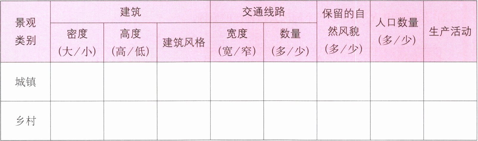 |景观类别|建筑| | |交通线路| |保留的自然风貌(多/少)|人口数量(多/少)|生产活动|