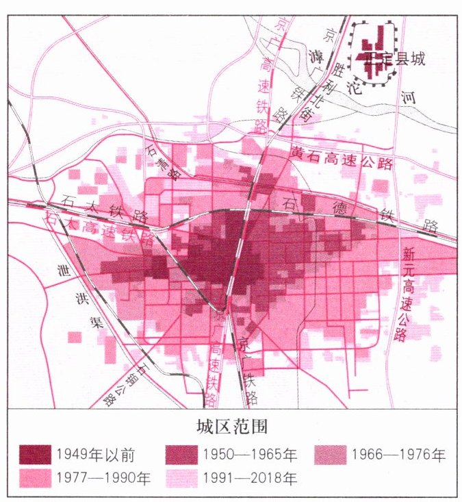 石家庄曾是只有30余户人家的小村庄。1903年和1907年,京汉铁路(京广铁路的组成部分)和石太铁路先后在石家庄建站,从而带动了石家庄的发展。读图5.2.2,完成下列各题。