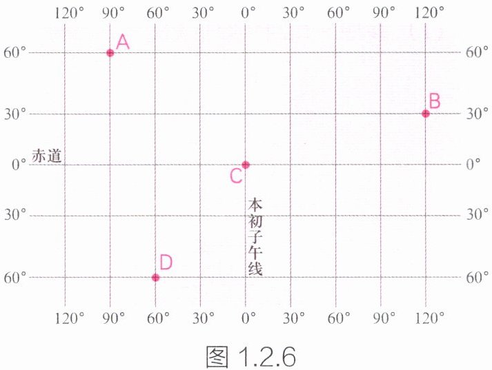 (1) 写出图 1.2.6 中 A、B、C、D 四点的经纬度。