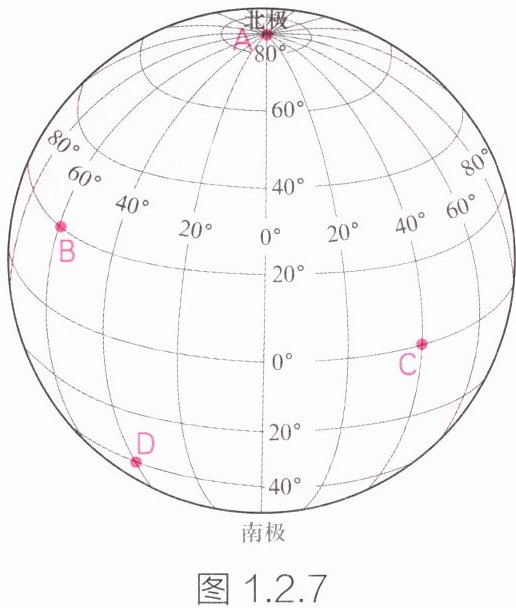 (2) 写出图 1.2.7 中 A、B、C、D 四点的经纬度。