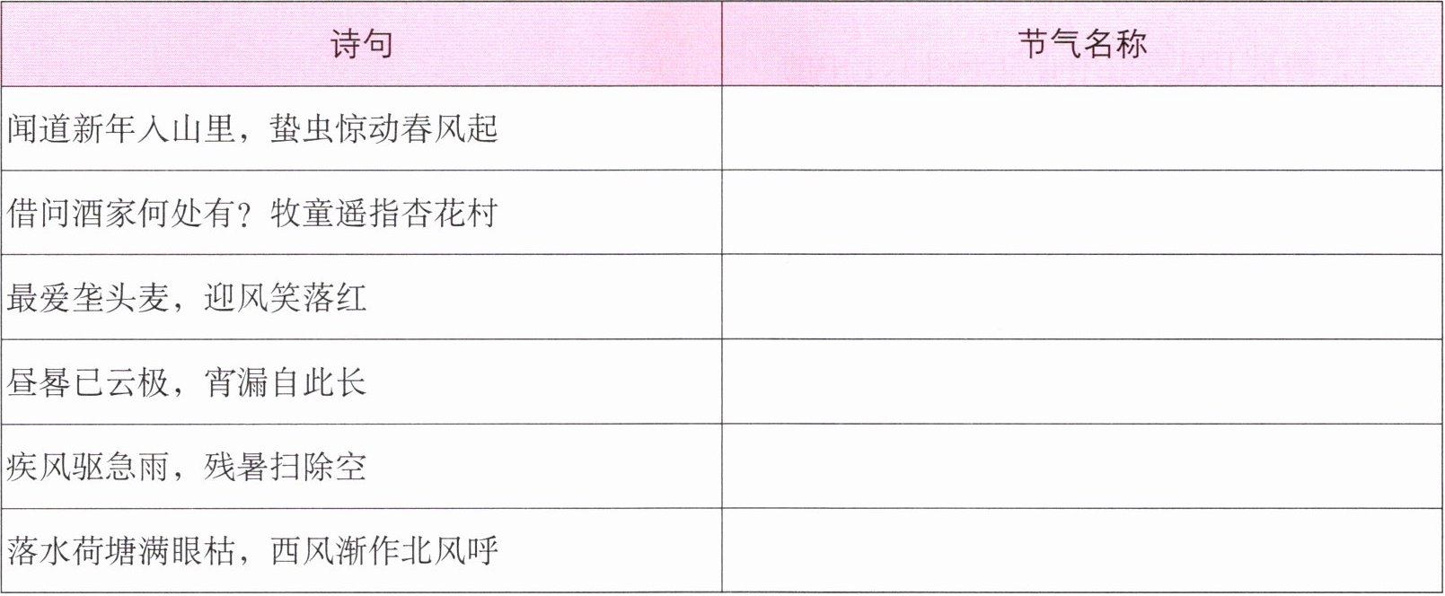 (2) 二十四节气不仅对农业生产及日常生活有着指导意义,更有其独特的文化价值。查找资料,写出表 1.3.2 中所列诗句描述的节气名称。