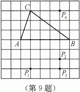 9. 【宜昌】如图所示,在方格纸中,以AB为一边作△ABP,使之与△ABC全等,从$P_1,P_2,P_3,P_4$四个点中找出符合条件的点P,则点P有 ( )