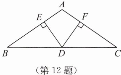 12. 如图所示,在△ABC中,AB= AC,过BC的中点D作DE⊥AB,DF⊥AC,垂足分别为E,F。