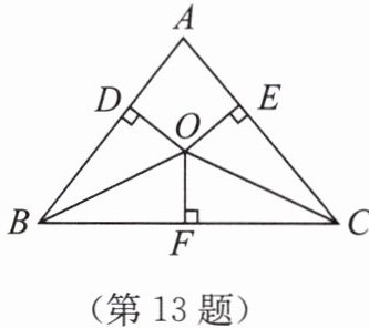 13. 如图所示,在△ABC中,O为∠ABC,∠ACB的平分线的交点,OD⊥AB,OE⊥AC,OF⊥BC,垂足分别为D,E,F。