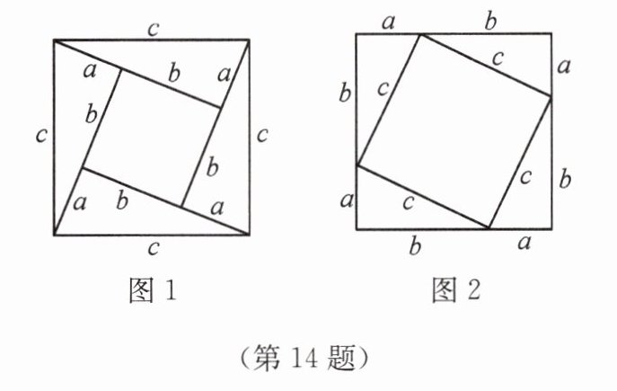 14.如图所示,图1和图2都是用四个全等的直角三角形围成的图形,请你选择图1或图2中的有关面积的等量关系证明数学中的勾股定理。