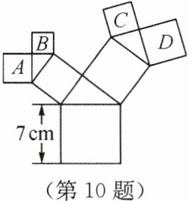 10.如图所示,图中所有的四边形都是正方形,所有的三角形都是直角三角形,其中最大的正方形的边长为7cm,则正方形A,B,C,D的面积之和为 ( )